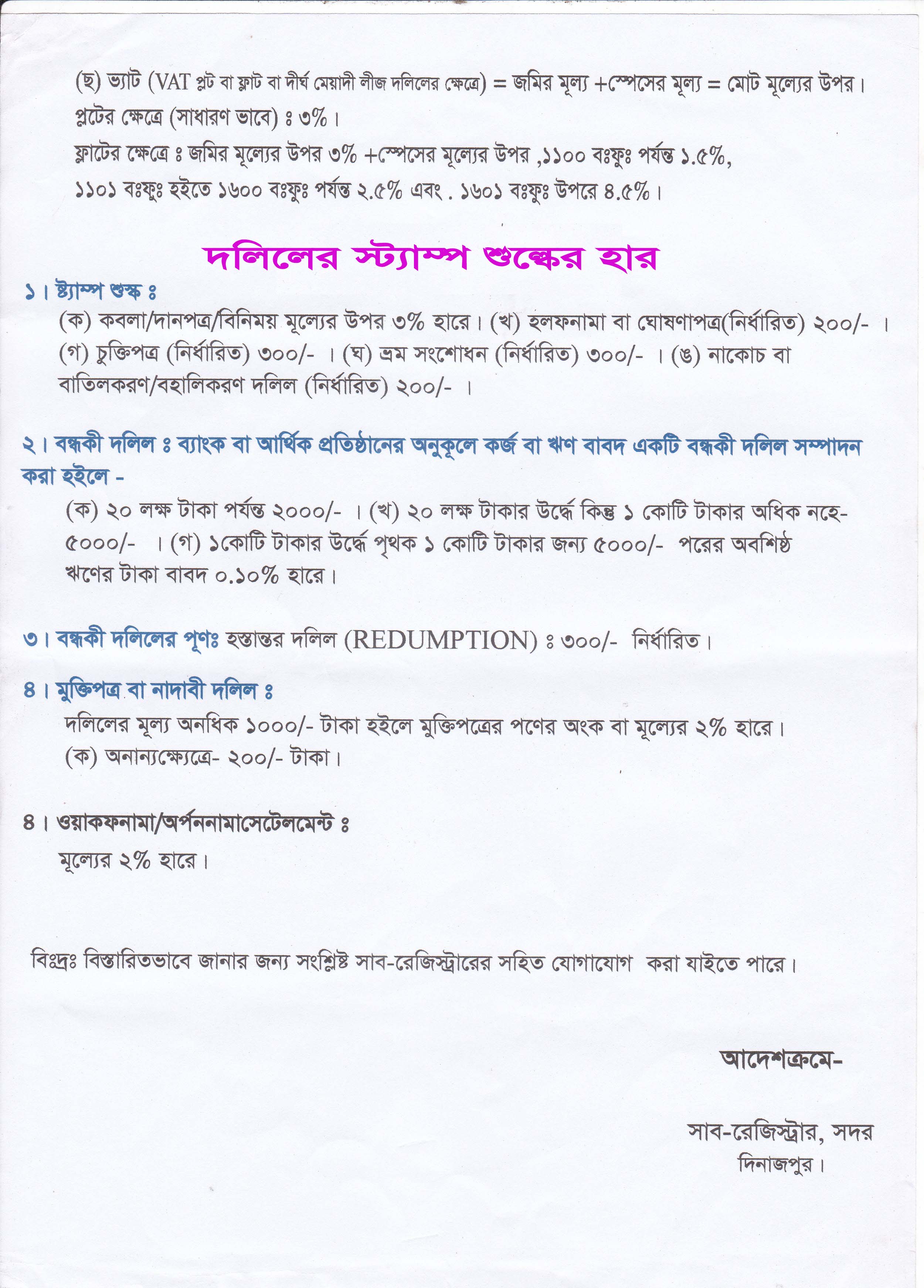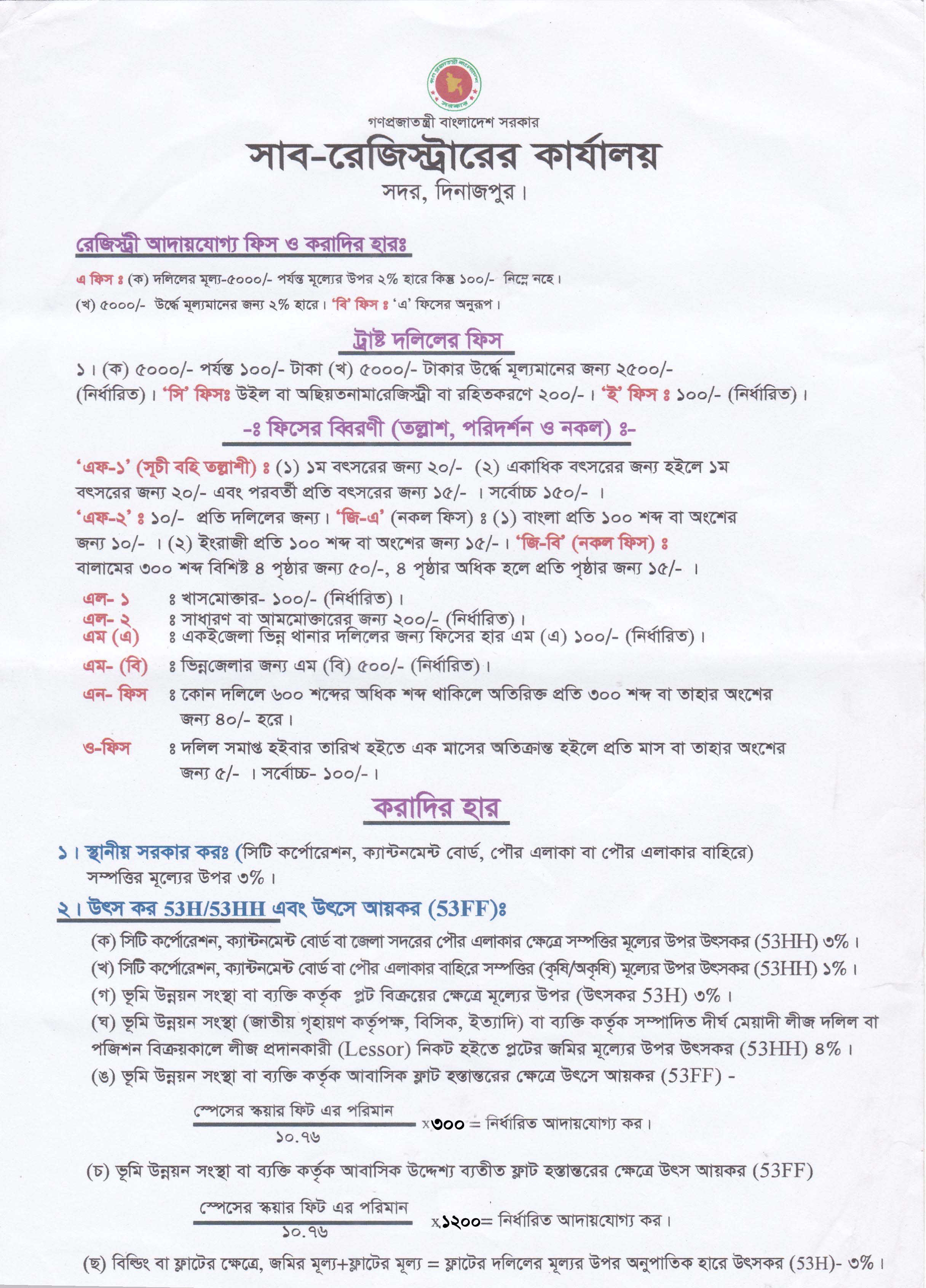 দলিল রেজিস্ট্রেশনের জন্য প্রদেয় ফিসের তালিকা
